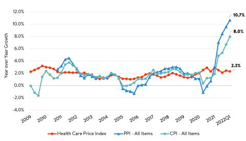 Figure 2: Health Care Price Index (HCPI), CPI, and PPI Year-over-Year Growth